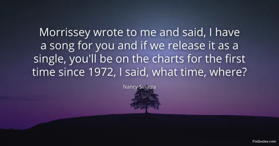 Sinatra, Nancy. (2026, January 17). Morrissey wrote to me and said, I have a song for you and if we release it as a single, you'll be on the charts for the first time since 1972, I said, what time, where? FixQuotes. https://fixquotes.com/quotes/morrissey-wrote-to-me-and-said-i-have-a-song-for-80356/