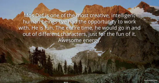 Scott, Jill. (2026, January 15). Mos Def is one of the most creative, intelligent human beings I've had the opportunity to work with. He is fun. The entire time, he would go in and out of different characters, just for the fun of it. Awesome energy. FixQuotes. https://fixquotes.com/quotes/mos-def-is-one-of-the-most-creative-intelligent-133396/