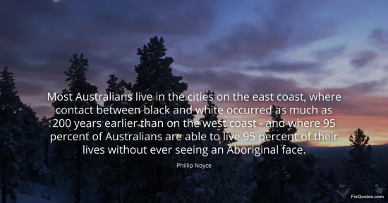 Noyce, Phillip. (2026, January 16). Most Australians live in the cities on the east coast, where contact between black and white occurred as much as 200 years earlier than on the west coast - and where 95 percent of Australians are able to live 95 percent of their lives without ever seeing an Aboriginal face. FixQuotes. https://fixquotes.com/quotes/most-australians-live-in-the-cities-on-the-east-115555/