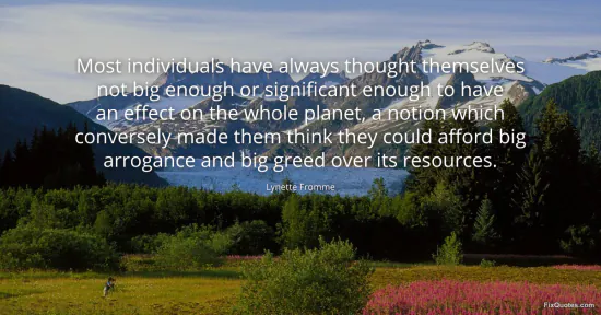 Fromme, Lynette. (2026, January 15). Most individuals have always thought themselves not big enough or significant enough to have an effect on the whole planet, a notion which conversely made them think they could afford big arrogance and big greed over its resources. FixQuotes. https://fixquotes.com/quotes/most-individuals-have-always-thought-themselves-152762/