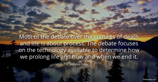 Fields, Suzanne. "Most of the debate over the cultures of death and life is about process. The debate focuses on the technology available to determine how we prolong life and how and when we end it." FixQuotes. January 16, 2026. https://fixquotes.com/quotes/most-of-the-debate-over-the-cultures-of-death-and-97445/.