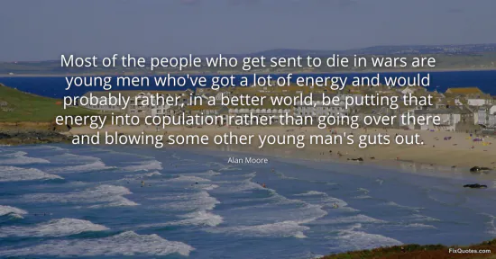 Moore, Alan. (2026, January 15). Most of the people who get sent to die in wars are young men who've got a lot of energy and would probably rather, in a better world, be putting that energy into copulation rather than going over there and blowing some other young man's guts out. FixQuotes. https://fixquotes.com/quotes/most-of-the-people-who-get-sent-to-die-in-wars-157646/