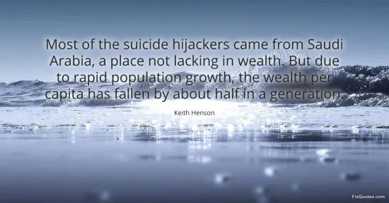 Henson, Keith. (2026, January 16). Most of the suicide hijackers came from Saudi Arabia, a place not lacking in wealth. But due to rapid population growth, the wealth per capita has fallen by about half in a generation. FixQuotes. https://fixquotes.com/quotes/most-of-the-suicide-hijackers-came-from-saudi-114567/