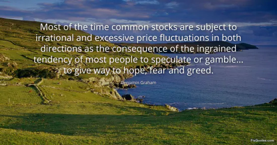 Graham, Benjamin. (2026, January 16). Most of the time common stocks are subject to irrational and excessive price fluctuations in both directions as the consequence of the ingrained tendency of most people to speculate or gamble... to give way to hope, fear and greed. FixQuotes. https://fixquotes.com/quotes/most-of-the-time-common-stocks-are-subject-to-123205/