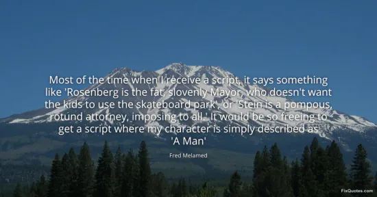 Melamed, Fred. "Most of the time when I receive a script, it says something like 'Rosenberg is the fat, slovenly Mayor, who doesn't want the kids to use the skateboard park', or 'Stein is a pompous, rotund attorney, imposing to all.' It would be so freeing to get a script where my character is simply described as 'A Man'." FixQuotes. January 16, 2026. https://fixquotes.com/quotes/most-of-the-time-when-i-receive-a-script-it-says-126110/.