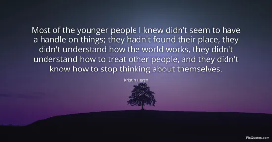 Hersh, Kristin. "Most of the younger people I knew didn't seem to have a handle on things; they hadn't found their place, they didn't understand how the world works, they didn't understand how to treat other people, and they didn't know how to stop thinking about themselves." FixQuotes. January 15, 2026. https://fixquotes.com/quotes/most-of-the-younger-people-i-knew-didnt-seem-to-161160/.