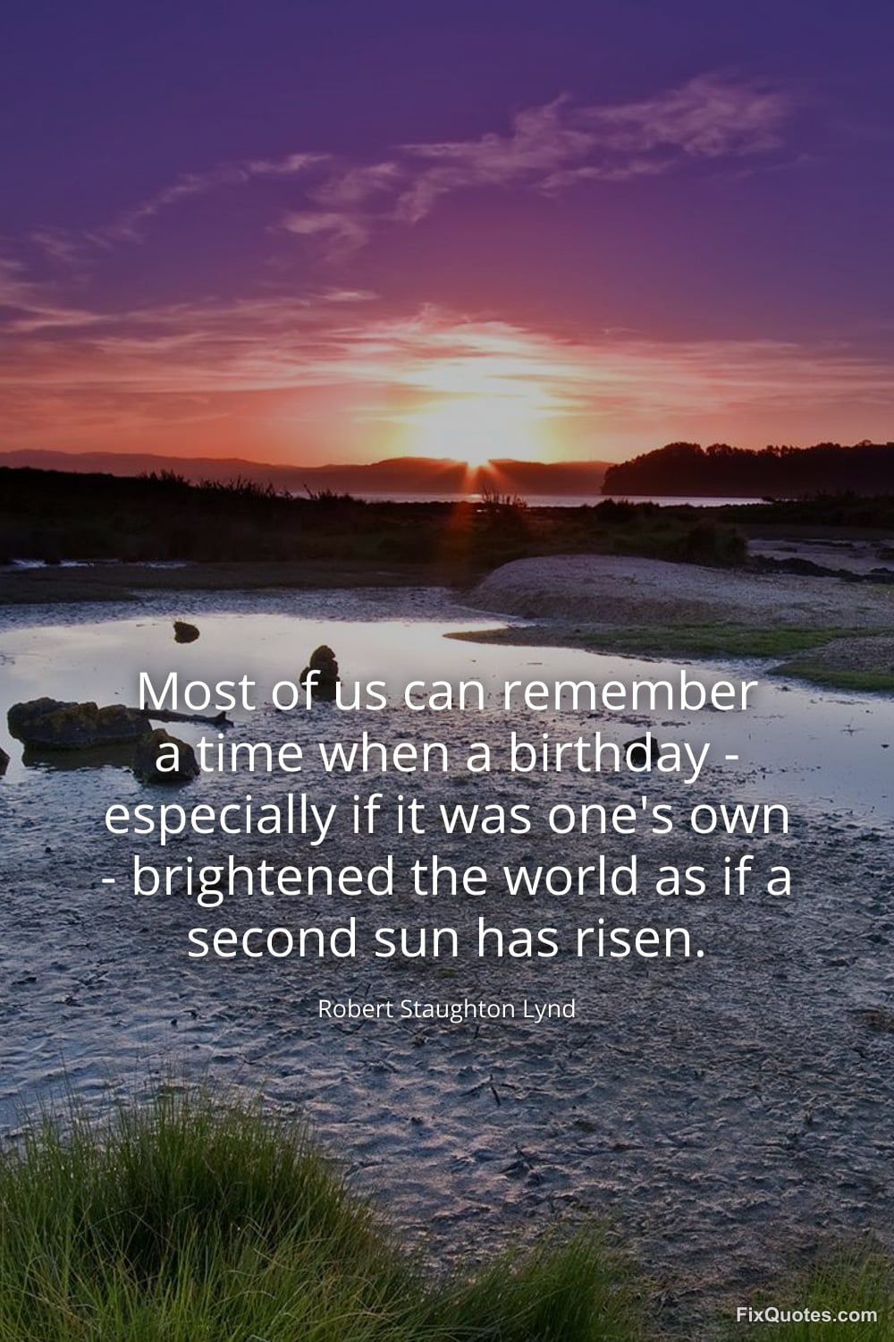 Lynd, Robert Staughton. "Most of us can remember a time when a birthday - especially if it was one's own - brightened the world as if a second sun has risen." FixQuotes. January 16, 2026. https://fixquotes.com/quotes/most-of-us-can-remember-a-time-when-a-birthday-134586/.