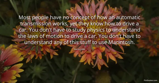 Jobs, Steve. "Most people have no concept of how an automatic transmission works, yet they know how to drive a car. You don't have to study physics to understand the laws of motion to drive a car. You don't have to understand any of this stuff to use Macintosh." FixQuotes. January 16, 2026. https://fixquotes.com/quotes/most-people-have-no-concept-of-how-an-automatic-83465/.