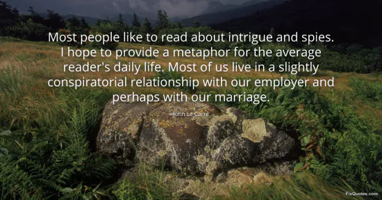 Carre, John Le. (2026, January 17). Most people like to read about intrigue and spies. I hope to provide a metaphor for the average reader's daily life. Most of us live in a slightly conspiratorial relationship with our employer and perhaps with our marriage. FixQuotes. https://fixquotes.com/quotes/most-people-like-to-read-about-intrigue-and-spies-60885/