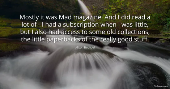 Bechdel, Alison. "Mostly it was Mad magazine. And I did read a lot of - I had a subscription when I was little, but I also had access to some old collections, the little paperbacks of the really good stuff." FixQuotes. January 17, 2026. https://fixquotes.com/quotes/mostly-it-was-mad-magazine-and-i-did-read-a-lot-38747/.