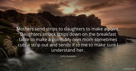 Guisewite, Cathy. (2026, January 17). Mothers send strips to daughters to make a point. Daughters smack strips down on the breakfast table to make a point. My own mom sometimes cuts a strip out and sends it to me to make sure I understand her. FixQuotes. https://fixquotes.com/quotes/mothers-send-strips-to-daughters-to-make-a-point-30454/
