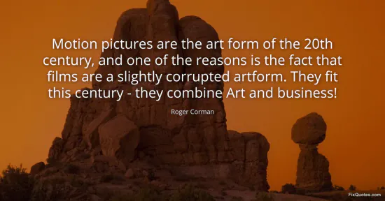 Corman, Roger. (2026, January 16). Motion pictures are the art form of the 20th century, and one of the reasons is the fact that films are a slightly corrupted artform. They fit this century - they combine Art and business! FixQuotes. https://fixquotes.com/quotes/motion-pictures-are-the-art-form-of-the-20th-132775/