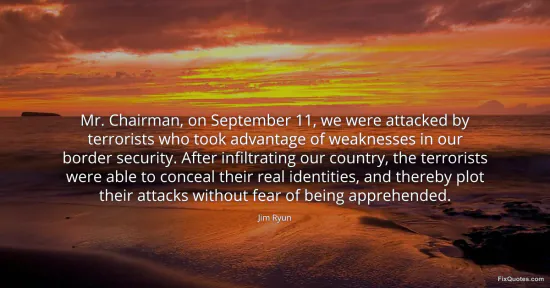 Ryun, Jim. "Mr. Chairman, on September 11, we were attacked by terrorists who took advantage of weaknesses in our border security. After infiltrating our country, the terrorists were able to conceal their real identities, and thereby plot their attacks without fear of being apprehended." FixQuotes. January 17, 2026. https://fixquotes.com/quotes/mr-chairman-on-september-11-we-were-attacked-by-67136/.
