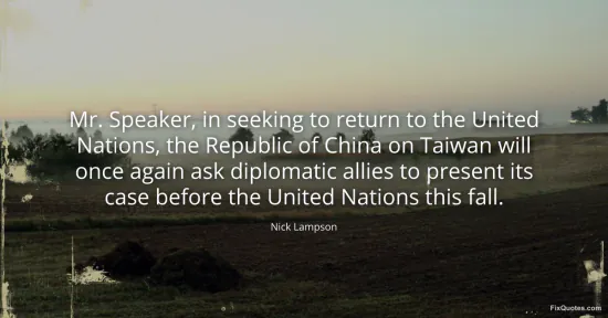 Lampson, Nick. "Mr. Speaker, in seeking to return to the United Nations, the Republic of China on Taiwan will once again ask diplomatic allies to present its case before the United Nations this fall." FixQuotes. January 17, 2026. https://fixquotes.com/quotes/mr-speaker-in-seeking-to-return-to-the-united-68665/.