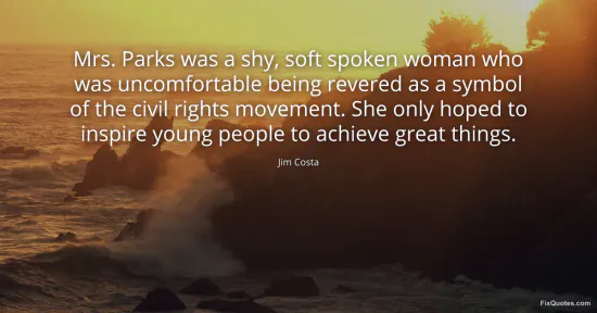 Costa, Jim. "Mrs. Parks was a shy, soft spoken woman who was uncomfortable being revered as a symbol of the civil rights movement. She only hoped to inspire young people to achieve great things." FixQuotes. January 17, 2026. https://fixquotes.com/quotes/mrs-parks-was-a-shy-soft-spoken-woman-who-was-67999/.
