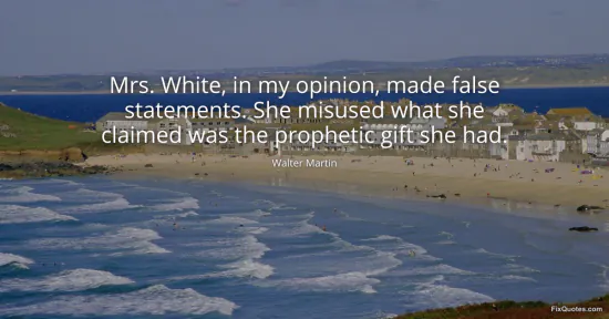Martin, Walter. "Mrs. White, in my opinion, made false statements. She misused what she claimed was the prophetic gift she had." FixQuotes. January 16, 2026. https://fixquotes.com/quotes/mrs-white-in-my-opinion-made-false-statements-she-104358/.