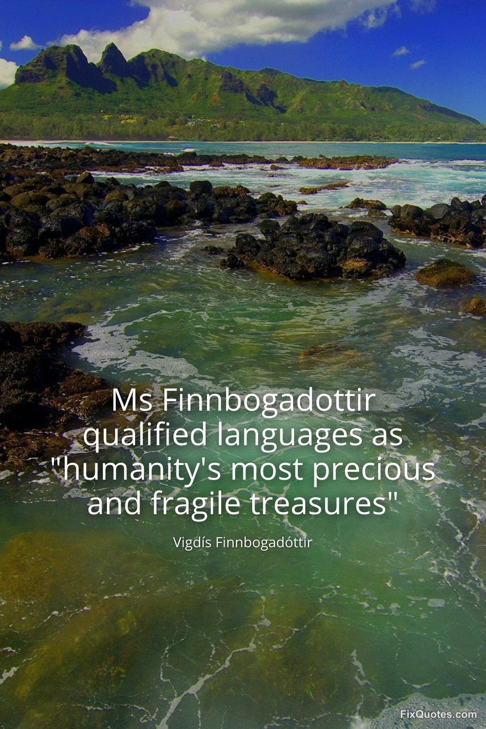 Finnbogadóttir, Vigdís. (2026, February 16). Ms Finnbogadottir qualified languages as "humanity's most precious and fragile treasures". FixQuotes. https://fixquotes.com/quotes/ms-finnbogadottir-qualified-languages-as-185424/