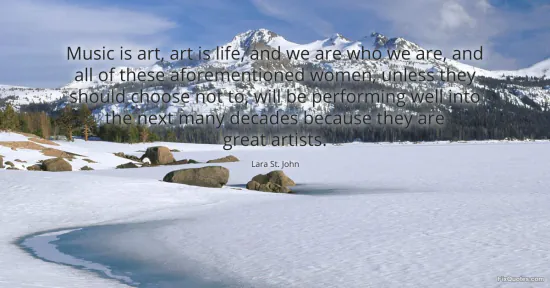 John, Lara St. "Music is art, art is life, and we are who we are, and all of these aforementioned women, unless they should choose not to, will be performing well into the next many decades because they are great artists." FixQuotes. January 16, 2026. https://fixquotes.com/quotes/music-is-art-art-is-life-and-we-are-who-we-are-84453/.