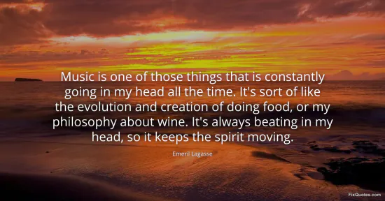 Lagasse, Emeril. "Music is one of those things that is constantly going in my head all the time. It's sort of like the evolution and creation of doing food, or my philosophy about wine. It's always beating in my head, so it keeps the spirit moving." FixQuotes. January 15, 2026. https://fixquotes.com/quotes/music-is-one-of-those-things-that-is-constantly-155398/.