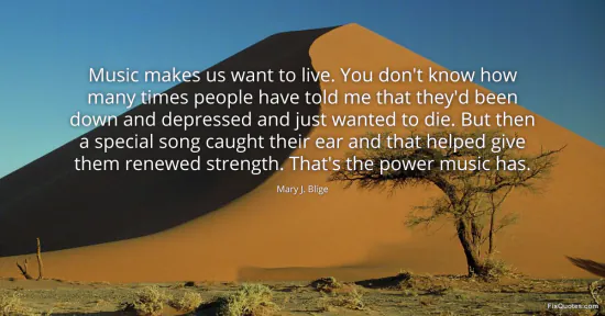 Blige, Mary J. "Music makes us want to live. You don't know how many times people have told me that they'd been down and depressed and just wanted to die. But then a special song caught their ear and that helped give them renewed strength. That's the power music has." FixQuotes. January 17, 2026. https://fixquotes.com/quotes/music-makes-us-want-to-live-you-dont-know-how-72708/.