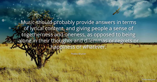 Bryson, Peabo. (2026, January 15). Music should probably provide answers in terms of lyrical content, and giving people a sense of togetherness and oneness, as opposed to being alone in their thoughts and dilemmas or regrets or happiness or whatever. FixQuotes. https://fixquotes.com/quotes/music-should-probably-provide-answers-in-terms-of-160717/
