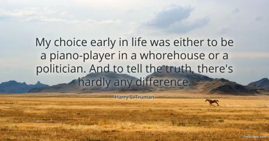 Truman, Harry S. (2026, February 8). My choice early in life was either to be a piano-player in a whorehouse or a politician. And to tell the truth, there's hardly any difference. FixQuotes. https://fixquotes.com/quotes/my-choice-early-in-life-was-either-to-be-a-19779/