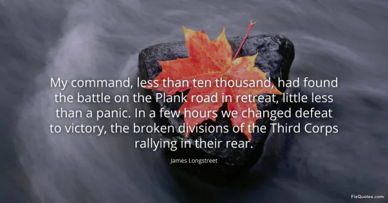 Longstreet, James. "My command, less than ten thousand, had found the battle on the Plank road in retreat, little less than a panic. In a few hours we changed defeat to victory, the broken divisions of the Third Corps rallying in their rear." FixQuotes. January 17, 2026. https://fixquotes.com/quotes/my-command-less-than-ten-thousand-had-found-the-56444/.