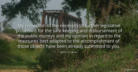 "My conviction of the necessity of further legislative provisions for the safe-keeping and disbursement of the public moneys and my opinion in regard to the measures best adapted to the accomplishment of those objects have been already submitted to you." FixQuotes, 16 Jan. 2026, https://fixquotes.com/quotes/my-conviction-of-the-necessity-of-further-93398/. Accessed 3 Mar. 2026.
