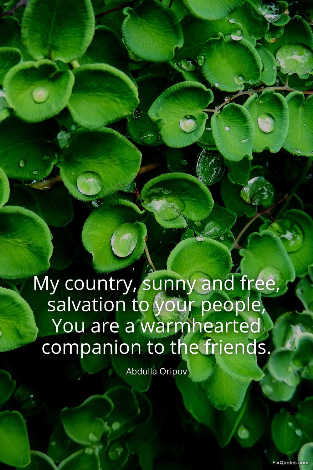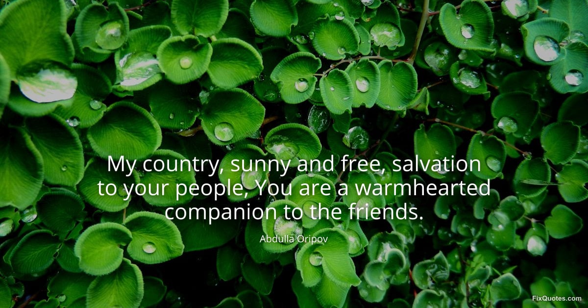 Oripov, Abdulla. (2026, March 7). My country, sunny and free, salvation to your people, You are a warmhearted companion to the friends. FixQuotes. https://fixquotes.com/quotes/my-country-sunny-and-free-salvation-to-your-185728/