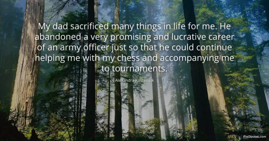 Kosteniuk, Alexandra. "My dad sacrificed many things in life for me. He abandoned a very promising and lucrative career of an army officer just so that he could continue helping me with my chess and accompanying me to tournaments." FixQuotes. January 15, 2026. https://fixquotes.com/quotes/my-dad-sacrificed-many-things-in-life-for-me-he-160929/.