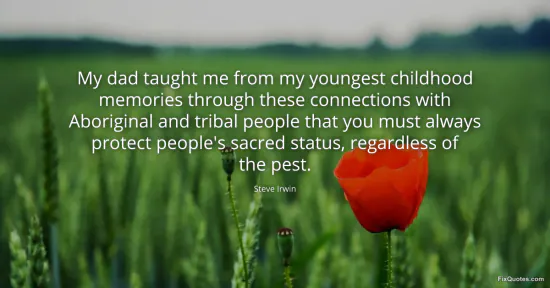 Irwin, Steve. "My dad taught me from my youngest childhood memories through these connections with Aboriginal and tribal people that you must always protect people's sacred status, regardless of the pest." FixQuotes. January 16, 2026. https://fixquotes.com/quotes/my-dad-taught-me-from-my-youngest-childhood-97542/.