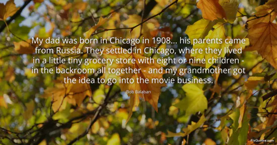 Balaban, Bob. (2026, January 17). My dad was born in Chicago in 1908... his parents came from Russia. They settled in Chicago, where they lived in a little tiny grocery store with eight or nine children - in the backroom all together - and my grandmother got the idea to go into the movie business. FixQuotes. https://fixquotes.com/quotes/my-dad-was-born-in-chicago-in-1908-his-parents-46982/