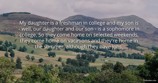 Slezak, Erika. "My daughter is a freshman in college and my son is - well, our daughter and our son - is a sophomore in college. So they come home on selected weekends, they come home on vacations and they're home in the summer, although they have jobs." FixQuotes. January 16, 2026. https://fixquotes.com/quotes/my-daughter-is-a-freshman-in-college-and-my-son-100439/.