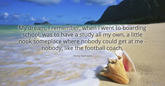 Mathews, Harry. "My dream, I remember, when I went to boarding school, was to have a study all my own, a little nook someplace where nobody could get at me - nobody, like the football coach." FixQuotes. January 16, 2026. https://fixquotes.com/quotes/my-dream-i-remember-when-i-went-to-boarding-112557/.