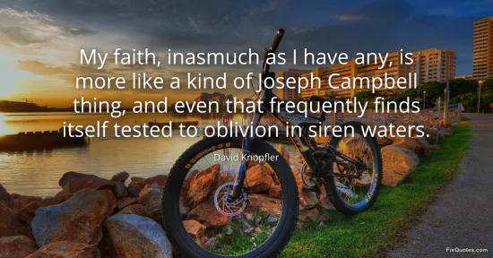 "My faith, inasmuch as I have any, is more like a kind of Joseph Campbell thing, and even that frequently finds itself tested to oblivion in siren waters." FixQuotes, 17 Jan. 2026, https://fixquotes.com/quotes/my-faith-inasmuch-as-i-have-any-is-more-like-a-59094/. Accessed 12 Feb. 2026.