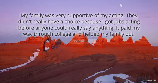 Naidu, Ajay. "My family was very supportive of my acting. They didn't really have a choice because I got jobs acting before anyone could really say anything. It paid my way through college and helped my family out." FixQuotes. January 15, 2026. https://fixquotes.com/quotes/my-family-was-very-supportive-of-my-acting-they-124414/.