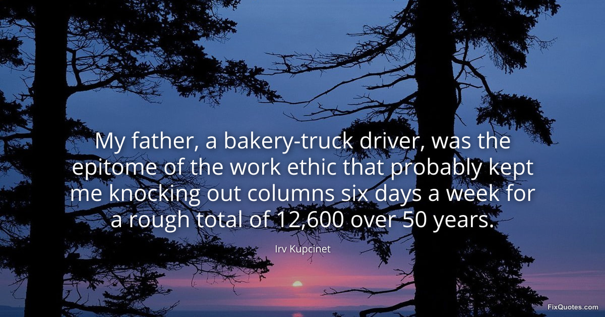 Kupcinet, Irv. (2026, January 15). My father, a bakery-truck driver, was the epitome of the work ethic that probably kept me knocking out columns six days a week for a rough total of 12,600 over 50 years. FixQuotes. https://fixquotes.com/quotes/my-father-a-bakery-truck-driver-was-the-epitome-173565/