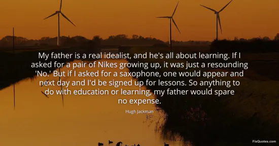 Jackman, Hugh. (2026, January 15). My father is a real idealist, and he's all about learning. If I asked for a pair of Nikes growing up, it was just a resounding 'No.' But if I asked for a saxophone, one would appear and next day and I'd be signed up for lessons. So anything to do with education or learning, my father would spare no expense. FixQuotes. https://fixquotes.com/quotes/my-father-is-a-real-idealist-and-hes-all-about-163839/