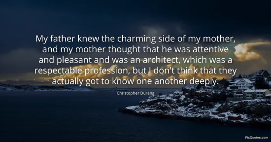 Durang, Christopher. (2026, January 16). My father knew the charming side of my mother, and my mother thought that he was attentive and pleasant and was an architect, which was a respectable profession, but I don't think that they actually got to know one another deeply. FixQuotes. https://fixquotes.com/quotes/my-father-knew-the-charming-side-of-my-mother-and-136866/