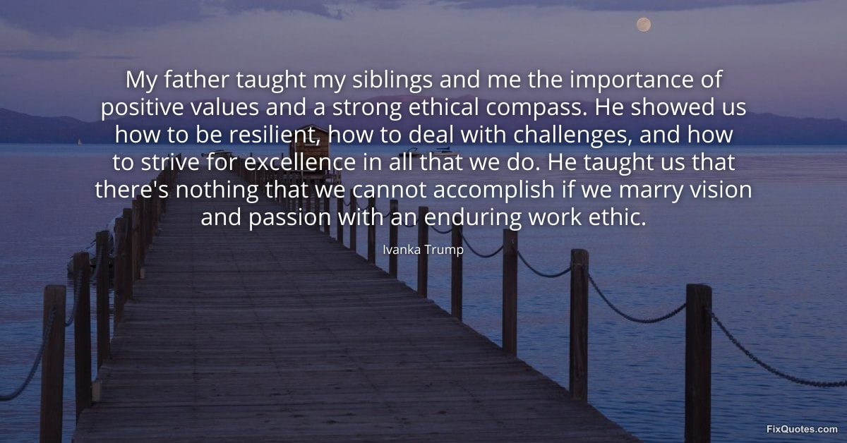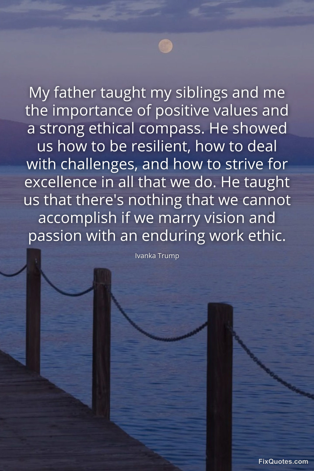 Trump, Ivanka. (2026, January 15). My father taught my siblings and me the importance of positive values and a strong ethical compass. He showed us how to be resilient, how to deal with challenges, and how to strive for excellence in all that we do. He taught us that there's nothing that we cannot accomplish if we marry vision and passion with an enduring work ethic. FixQuotes. https://fixquotes.com/quotes/my-father-taught-my-siblings-and-me-the-173310/