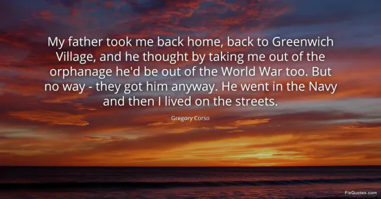 Corso, Gregory. (2026, January 16). My father took me back home, back to Greenwich Village, and he thought by taking me out of the orphanage he'd be out of the World War too. But no way - they got him anyway. He went in the Navy and then I lived on the streets. FixQuotes. https://fixquotes.com/quotes/my-father-took-me-back-home-back-to-greenwich-105315/