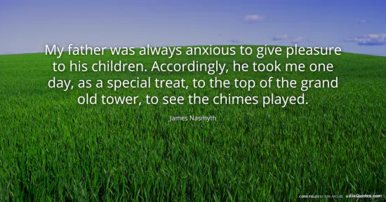 Nasmyth, James. "My father was always anxious to give pleasure to his children. Accordingly, he took me one day, as a special treat, to the top of the grand old tower, to see the chimes played." FixQuotes. January 18, 2026. https://fixquotes.com/quotes/my-father-was-always-anxious-to-give-pleasure-to-3293/.