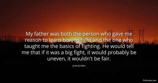 Jordan, June. (2026, January 16). My father was both the person who gave me reason to learn how to fight and the one who taught me the basics of fighting. He would tell me that if it was a big fight, it would probably be uneven, it wouldn't be fair. FixQuotes. https://fixquotes.com/quotes/my-father-was-both-the-person-who-gave-me-reason-109747/