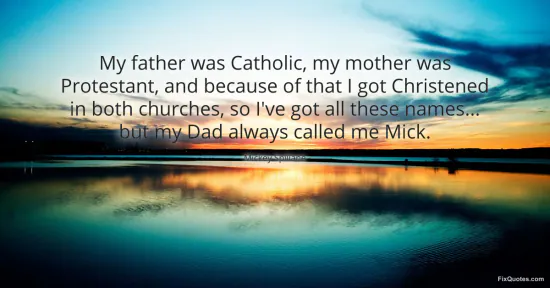 "My father was Catholic, my mother was Protestant, and because of that I got Christened in both churches, so I've got all these names... but my Dad always called me Mick." FixQuotes, 15 Jan. 2026, https://fixquotes.com/quotes/my-father-was-catholic-my-mother-was-protestant-152946/. Accessed 21 Feb. 2026.