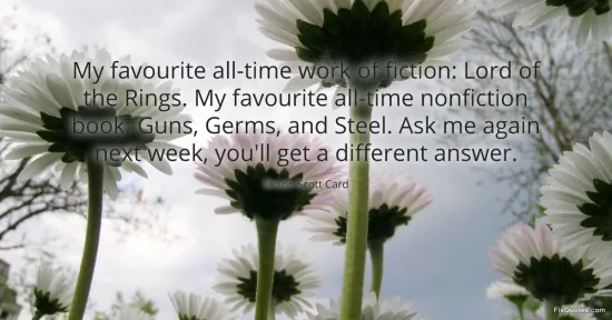 Card, Orson Scott. (2026, January 15). My favourite all-time work of fiction: Lord of the Rings. My favourite all-time nonfiction book: Guns, Germs, and Steel. Ask me again next week, you'll get a different answer. FixQuotes. https://fixquotes.com/quotes/my-favourite-all-time-work-of-fiction-lord-of-the-159042/