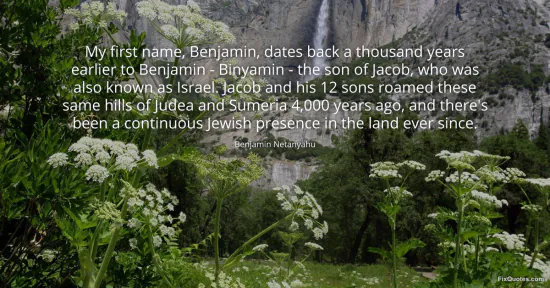 Netanyahu, Benjamin. "My first name, Benjamin, dates back a thousand years earlier to Benjamin - Binyamin - the son of Jacob, who was also known as Israel. Jacob and his 12 sons roamed these same hills of Judea and Sumeria 4,000 years ago, and there's been a continuous Jewish presence in the land ever since." FixQuotes. January 17, 2026. https://fixquotes.com/quotes/my-first-name-benjamin-dates-back-a-thousand-74847/.