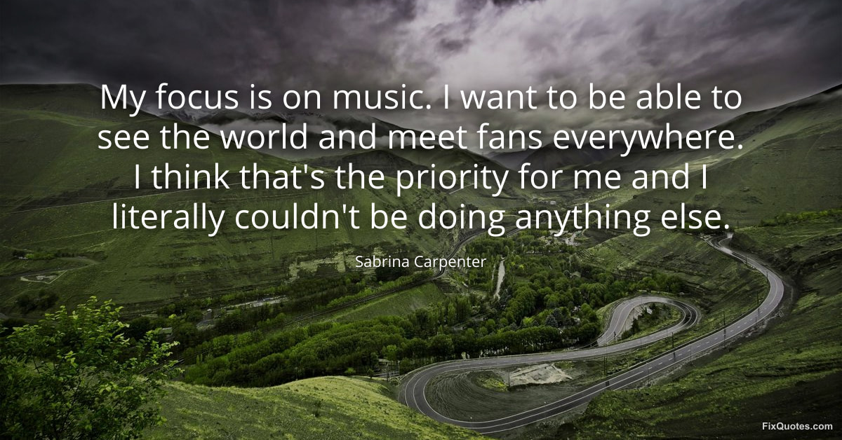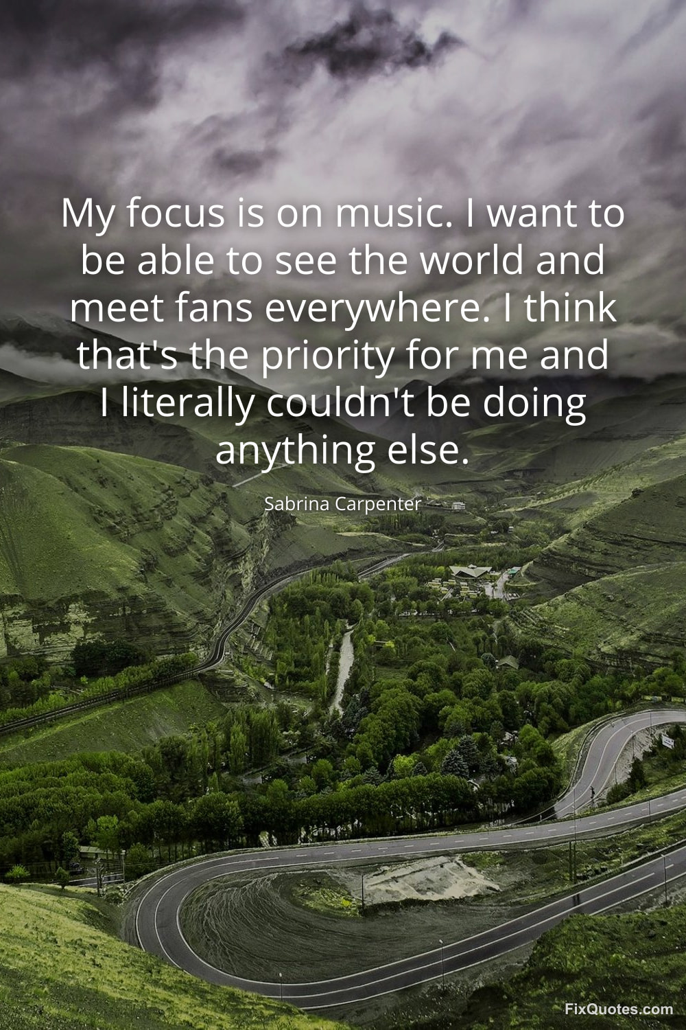 Carpenter, Sabrina. "My focus is on music. I want to be able to see the world and meet fans everywhere. I think that's the priority for me and I literally couldn't be doing anything else." FixQuotes. January 26, 2026. https://fixquotes.com/quotes/my-focus-is-on-music-i-want-to-be-able-to-see-the-184562/.