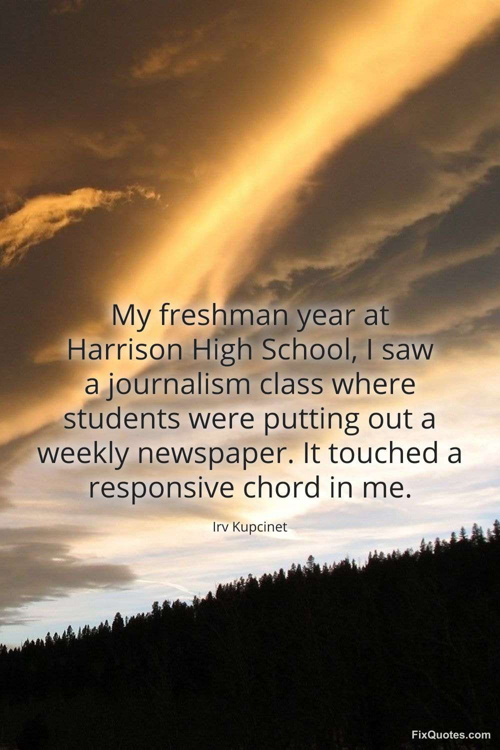 Kupcinet, Irv. (2026, January 15). My freshman year at Harrison High School, I saw a journalism class where students were putting out a weekly newspaper. It touched a responsive chord in me. FixQuotes. https://fixquotes.com/quotes/my-freshman-year-at-harrison-high-school-i-saw-a-173571/