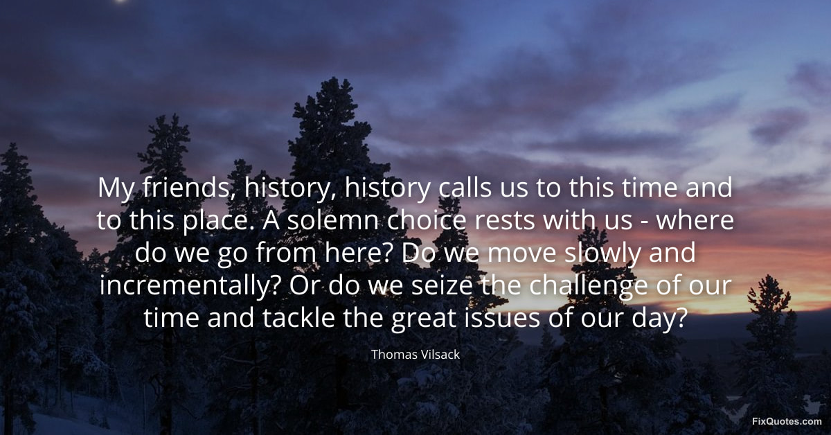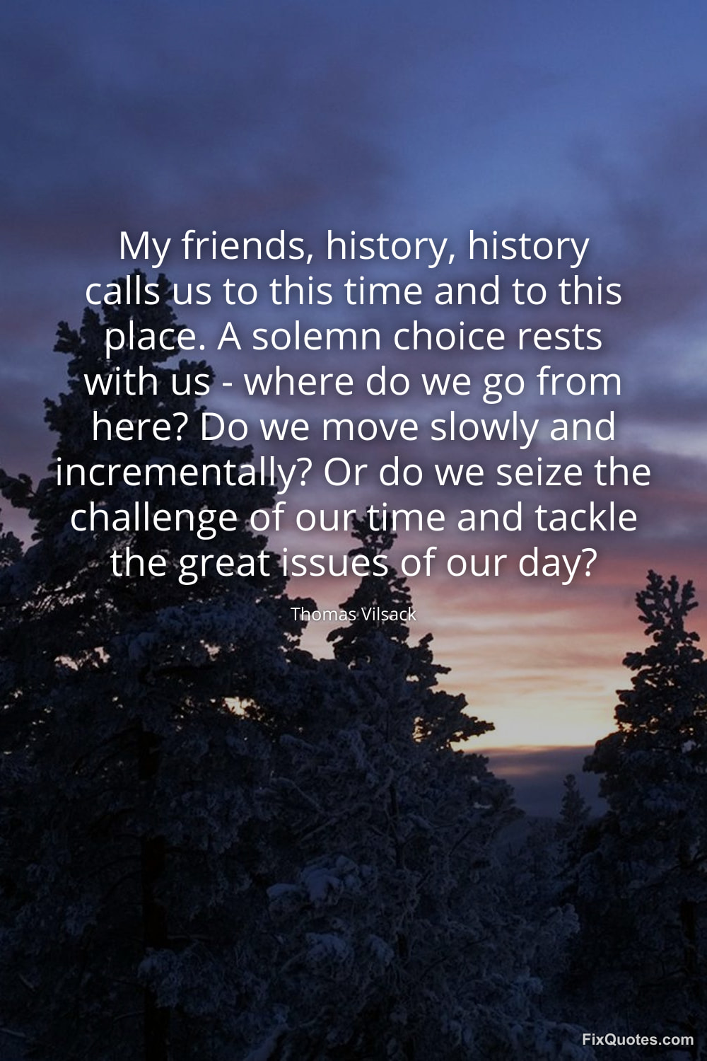 Vilsack, Thomas. (2026, February 16). My friends, history, history calls us to this time and to this place. A solemn choice rests with us - where do we go from here? Do we move slowly and incrementally? Or do we seize the challenge of our time and tackle the great issues of our day? FixQuotes. https://fixquotes.com/quotes/my-friends-history-history-calls-us-to-this-time-129508/