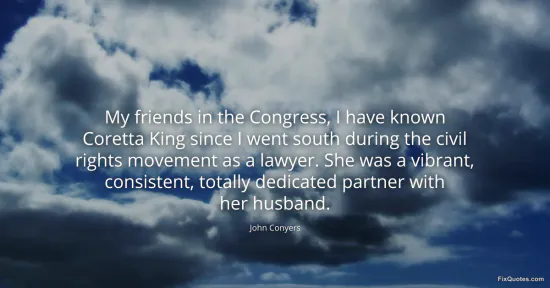 Conyers, John. "My friends in the Congress, I have known Coretta King since I went south during the civil rights movement as a lawyer. She was a vibrant, consistent, totally dedicated partner with her husband." FixQuotes. January 16, 2026. https://fixquotes.com/quotes/my-friends-in-the-congress-i-have-known-coretta-125148/.
